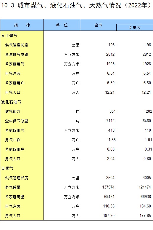 10-3 城市煤气、液化石油气、天然气情况(2022年)