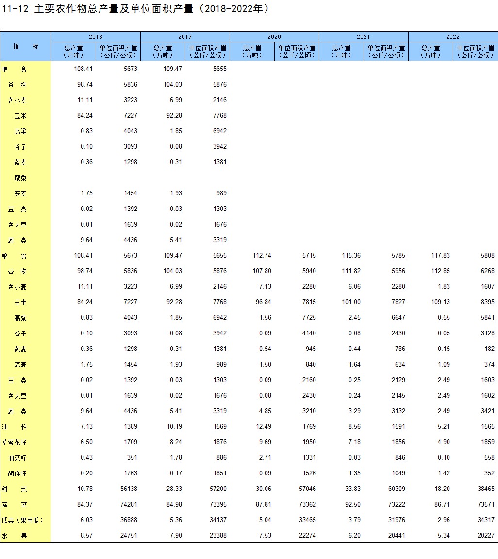 11-12 主要农作物总产量及单位面积产量(2018-2022年)