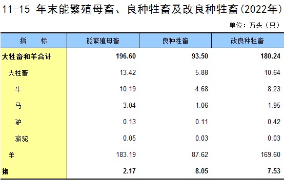 11-15 年末能繁殖母畜、良种牲畜及改良种牲畜(2022年)