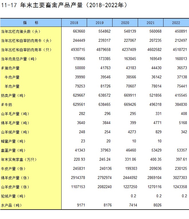 11-17 年末主要畜禽产品产量(2018-2022年)