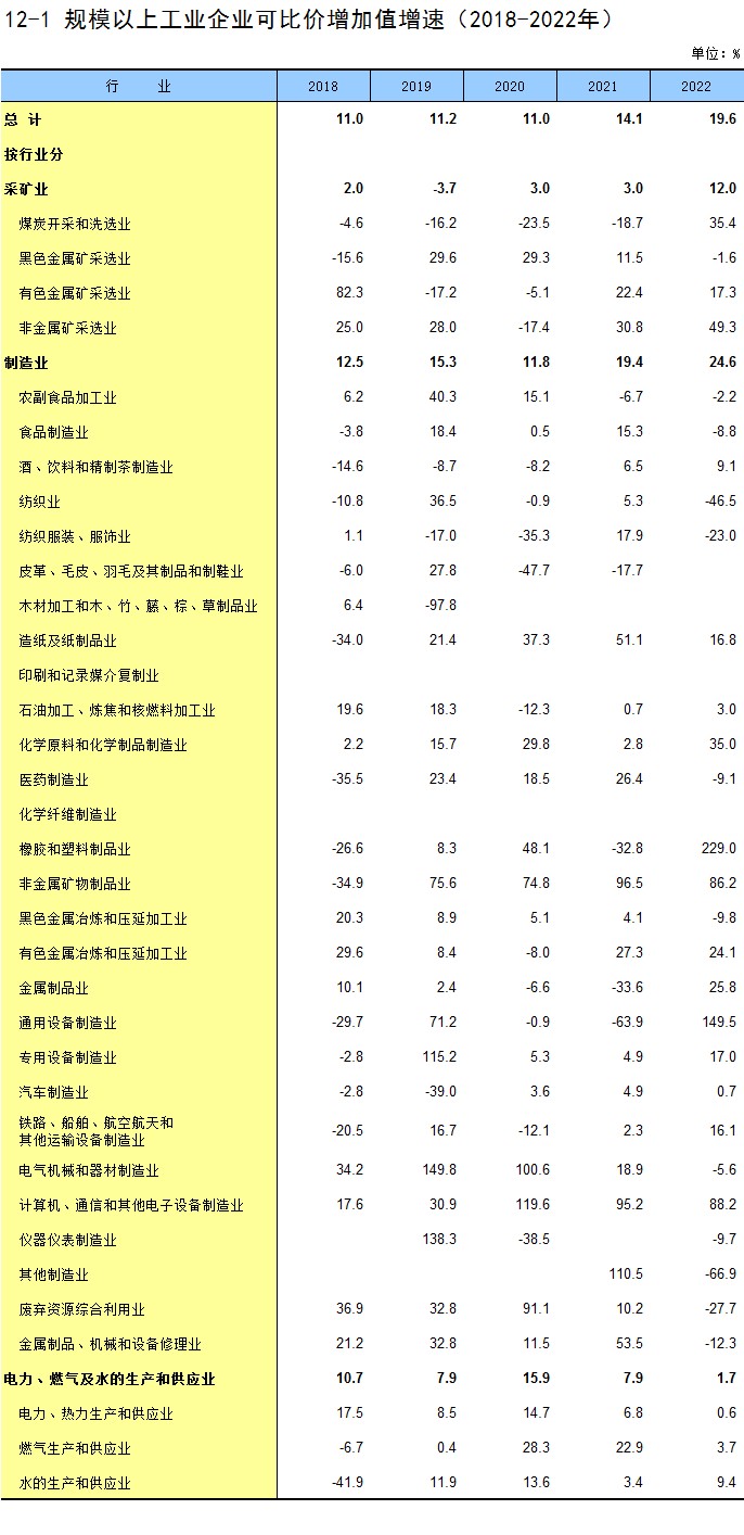 12-1 规模以上工业企业可比价增加值增速(2018-2022年)
