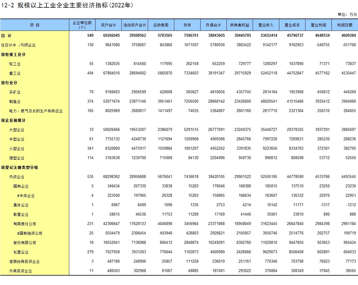 12-2 规模以上工业企业主要经济指标(2022年)