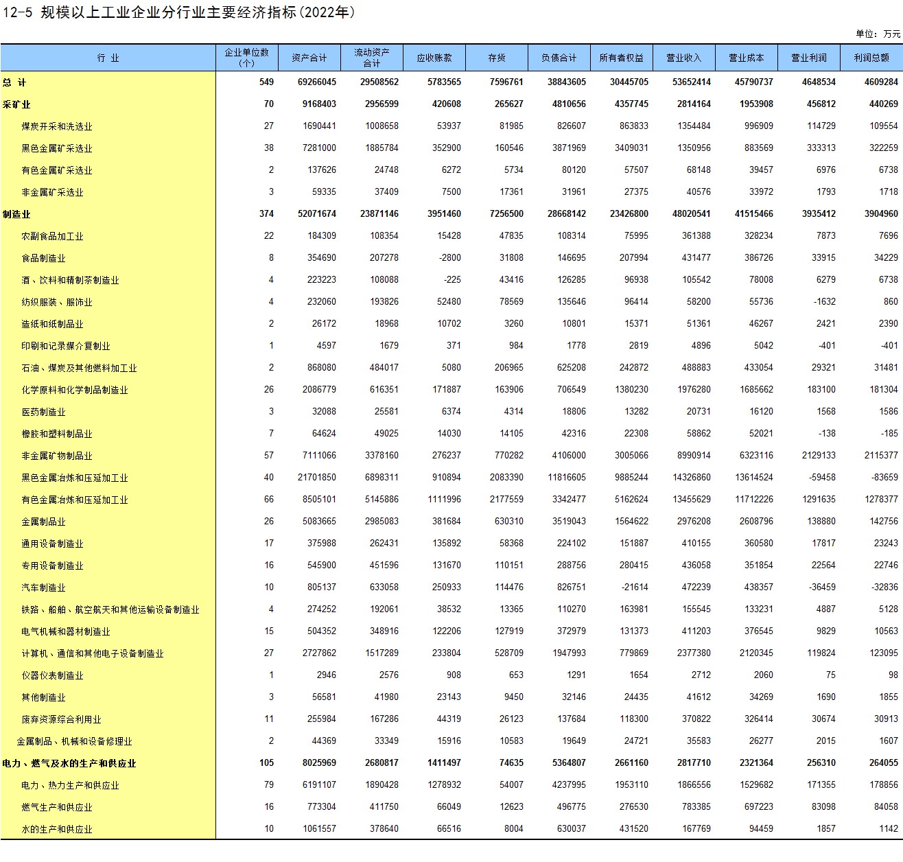 12-5 规模以上工业企业分行业主要经济指标(2022年)