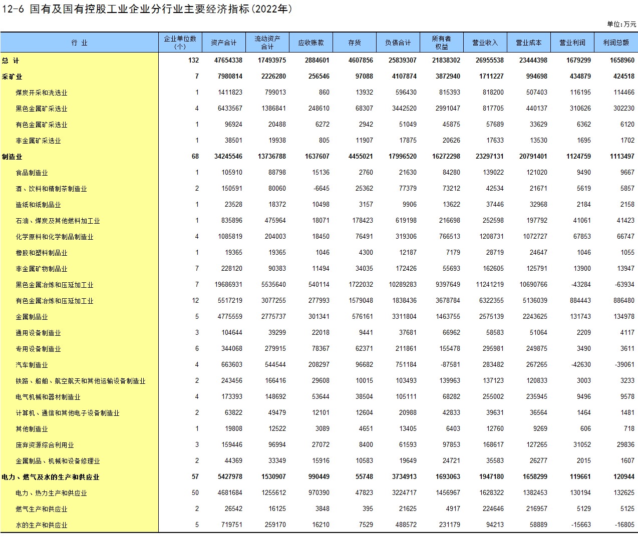 12-6 国有及国有控股工业企业分行业主要经济指标(2022年)