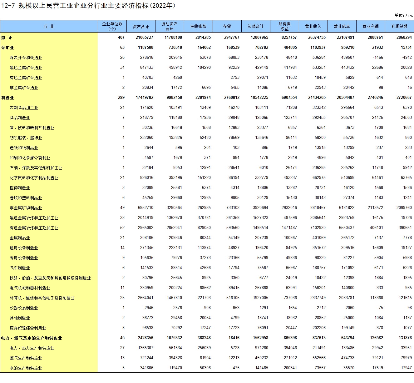 12-7 规模以上民营工业企业分行业主要经济指标(2022年)