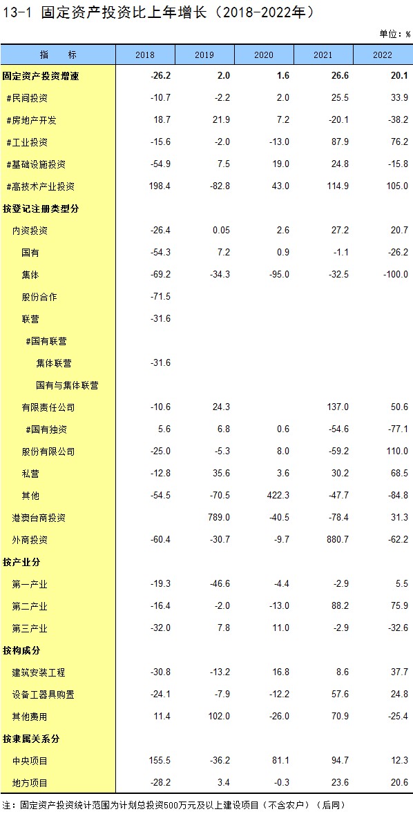 13-1 固定资产投资比上年增长(2018-2022年)