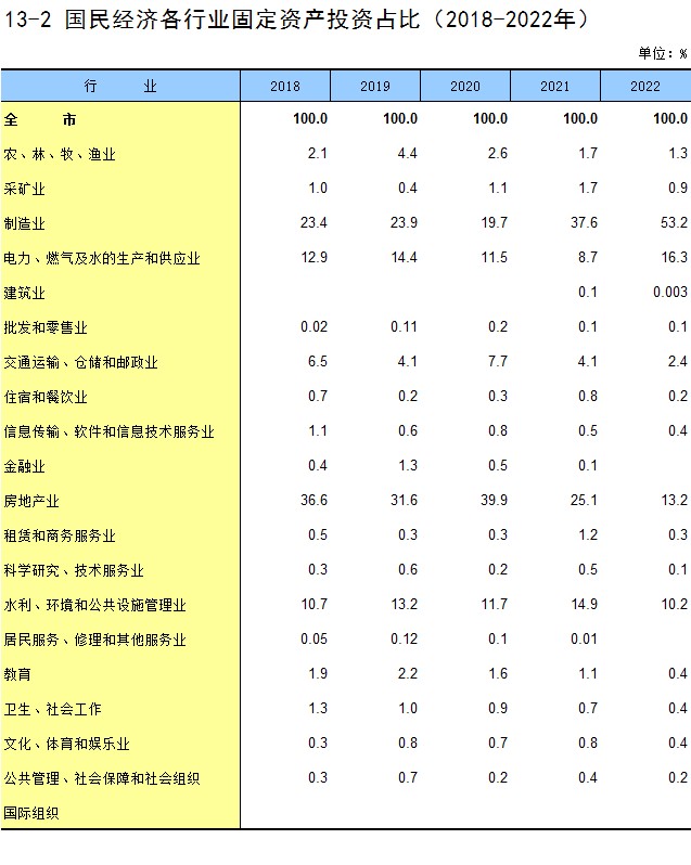 13-2 国民经济各行业固定资产投资占比(2018-2022年)