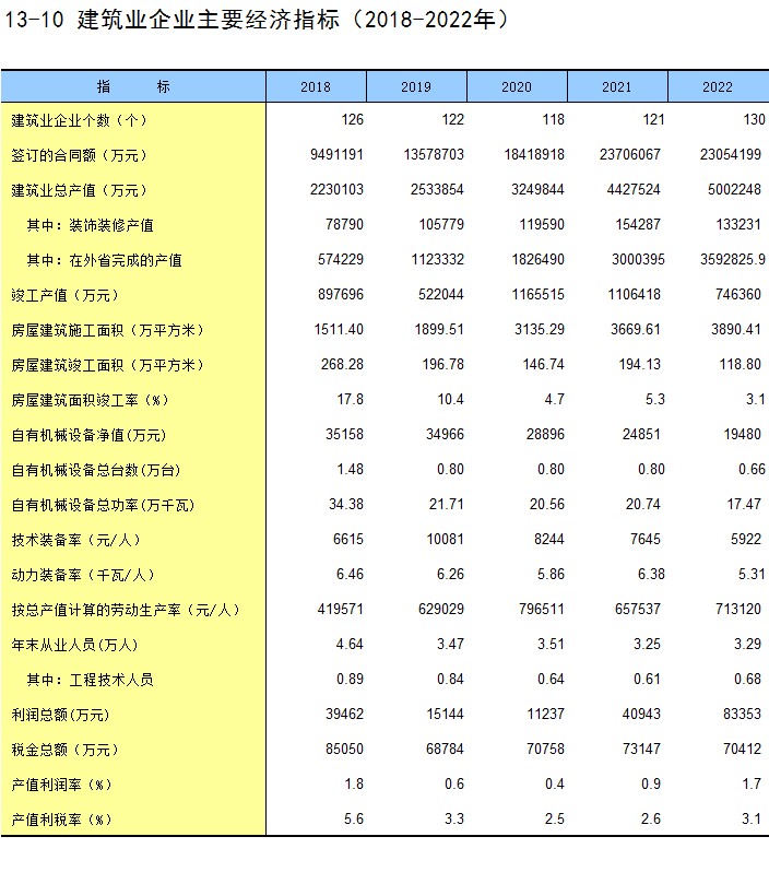 13-10 建筑业企业主要经济指标(2018-2022年)