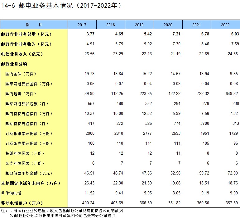 14-6 邮电业务基本情况(2017-2022年)