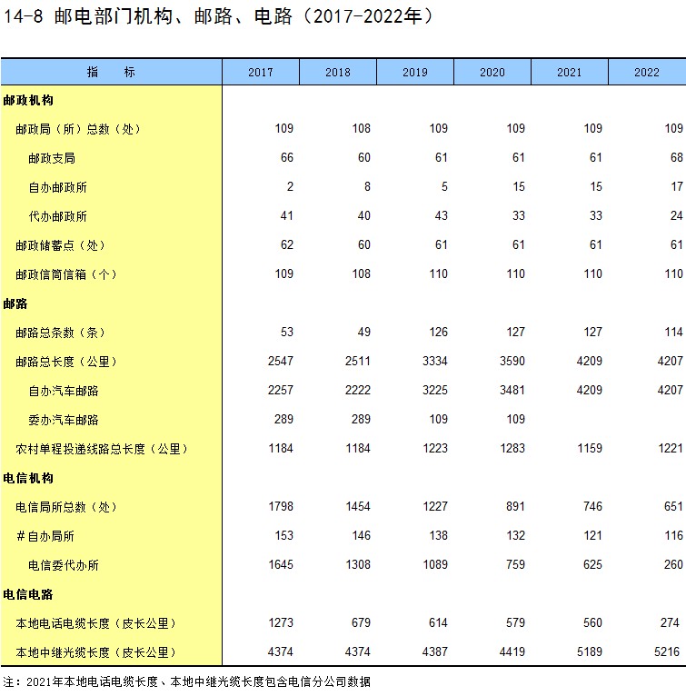 14-8 邮电部门机构、邮路、电路(2017-2022年)