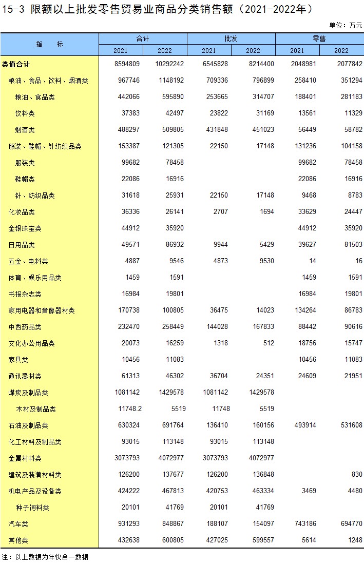 15-3 限额以上批发零售贸易业商品分类销售额(2021-2022年)