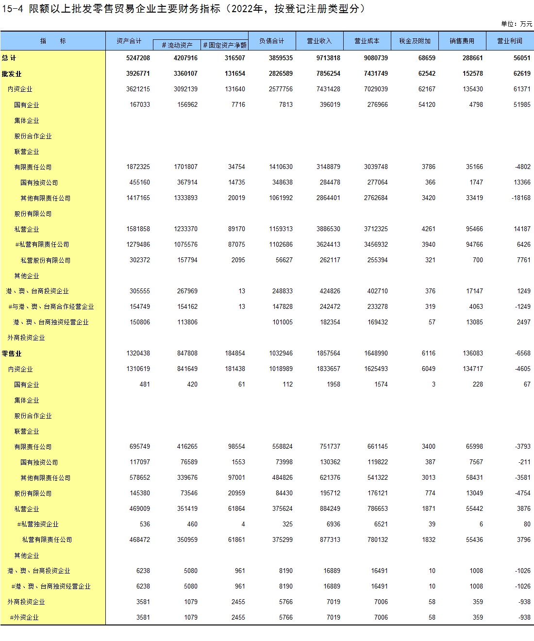 15-4 限额以上批发零售贸易企业主要财务指标(2022年,按登记注册类型分)
