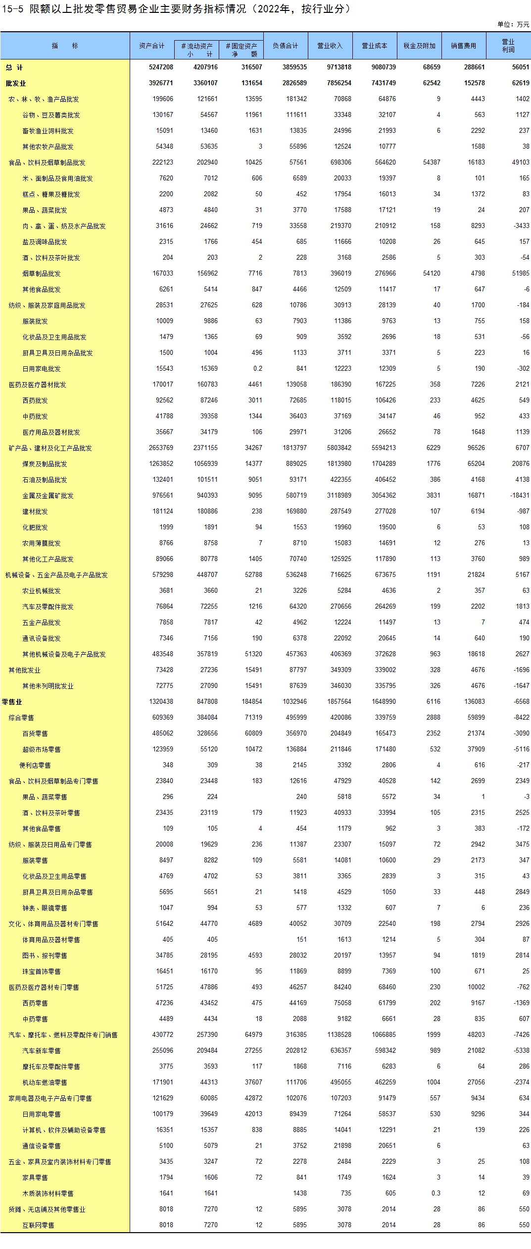 15-5 限额以上批发零售贸易企业主要财务指标情况(2022年,按行业分)