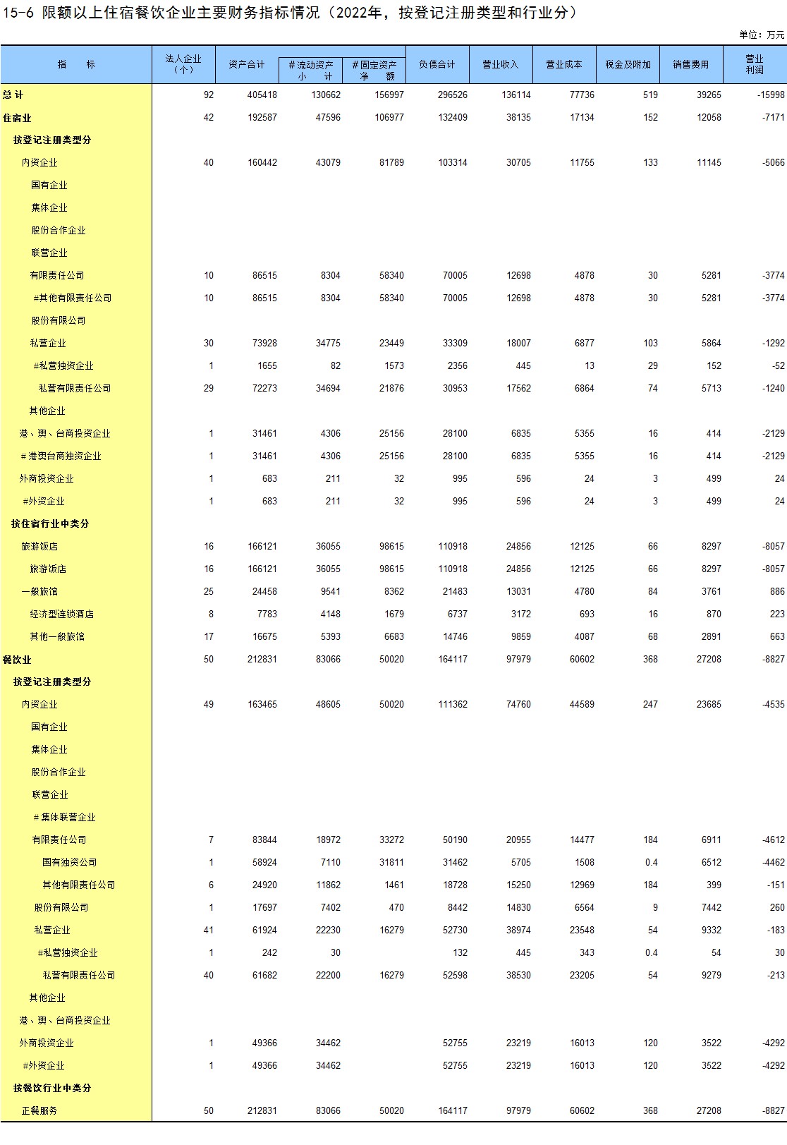 15-6 限额以上住宿餐饮企业主要财务指标情况(2022年,按登记注册类型和行业分)