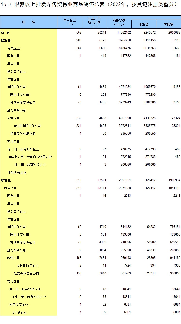 15-7 限额以上批发零售贸易业商品销售总额(2022年,按登记注册类型分)