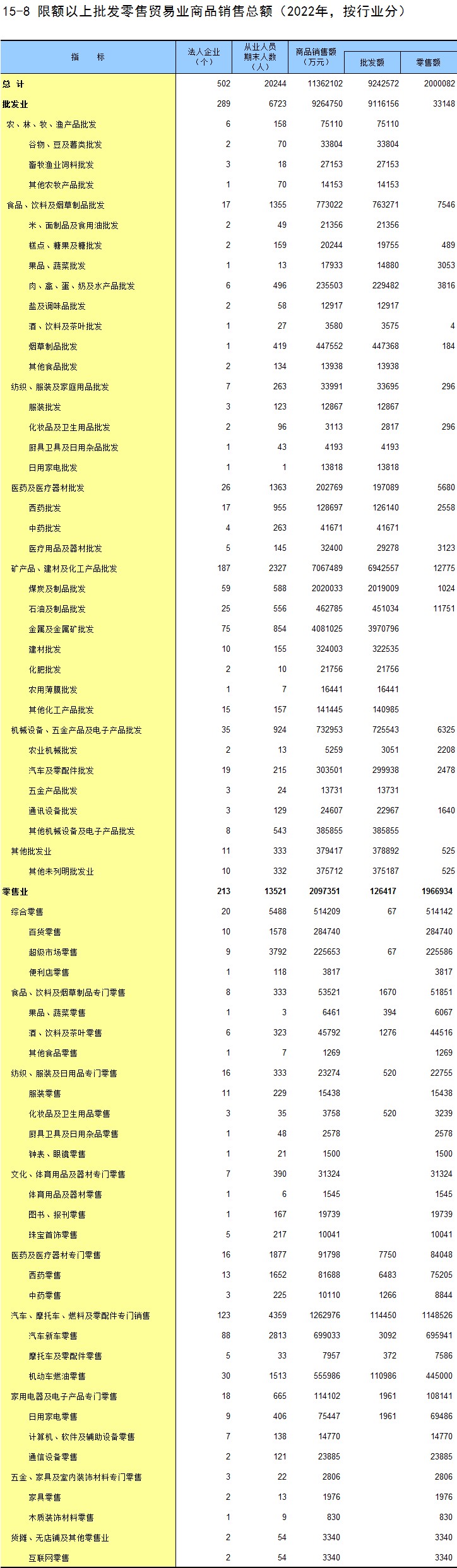 15-8 限额以上批发零售贸易业商品销售总额(2022年,按行业分)