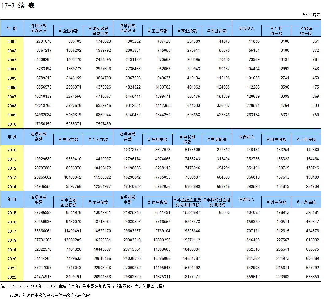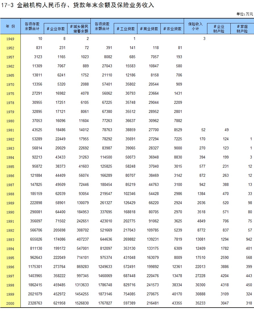 17-3 金融机构人民币存、贷款年末余额及保险业务收入