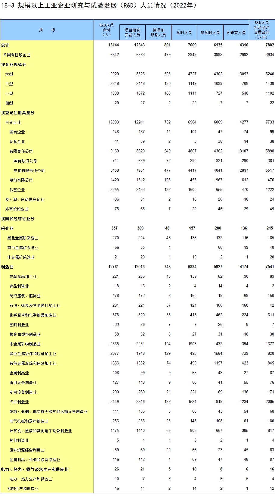 18-3 规模以上工业企业研究与试验发展(R&D)人员情况(2022年)