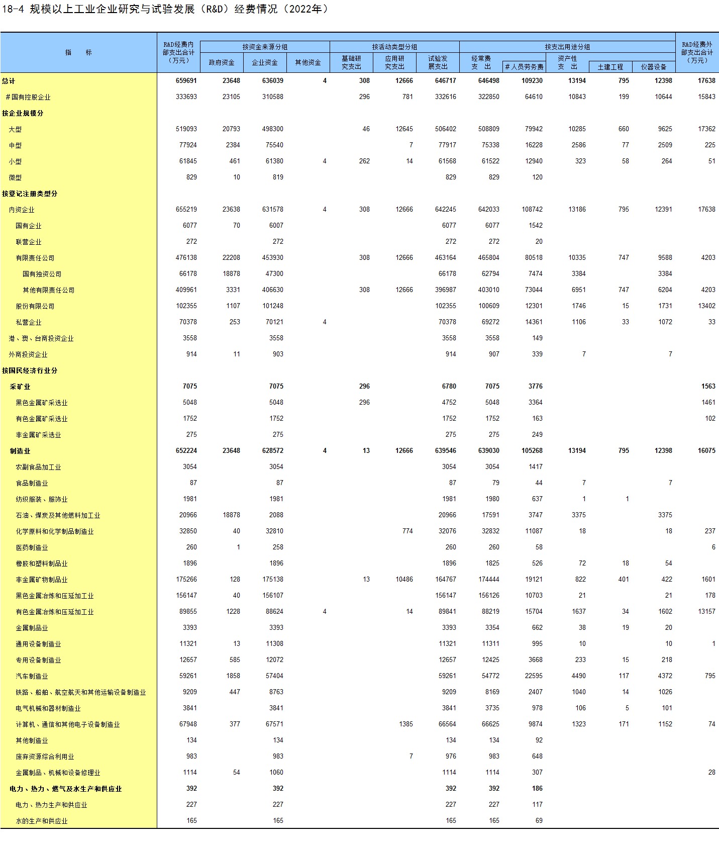 18-4 规模以上工业企业研究与试验发展(R&D)经费情况(2022年)