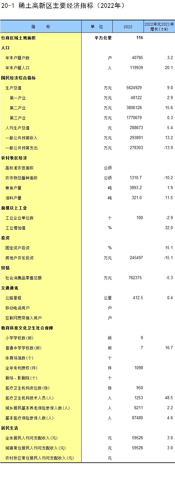 20-1 稀土高新区主要经济指标(2022年)