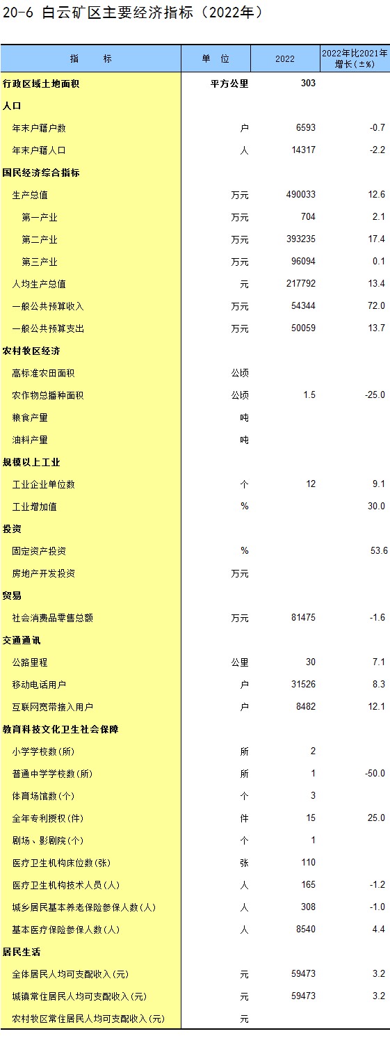 20-6 白云矿区主要经济指标(2022年)