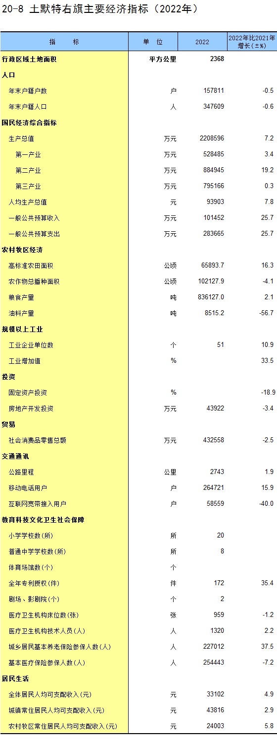 20-8 土默特右旗主要经济指标(2022年)