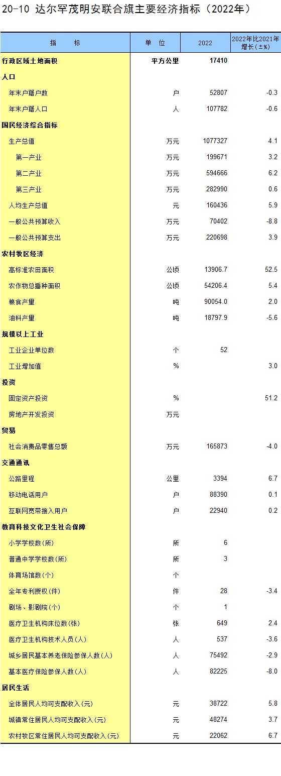 20-10 达尔罕茂明安联合旗主要经济指标(2022年)