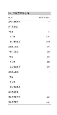 14 房地产开发投资 指 标 1-2月增长(%) 房地产开发投资 5.3 按工程用途分 # 住宅 7.3 办公楼 250.0 商业营业用房 114.1 房屋施工面积 -17.6 # 新开工面积 -18.5 # 住宅 -18.4 办公楼 23.0 商业营业用房 -39.0 房屋竣工面积 — # 住宅 — 办公楼 — 商业营业用房 — 竣工房屋价值 — 商品房销售面积 -46.9 商品房销售额 -18.0