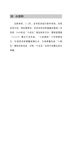 36 总的来看,1-2月,全市经济运行稳中快进,实现 良好开局。但也要看到,经济回升向好基础还需进一步 巩固。2025年是“十四五”规划收官之年,要紧紧围绕 “3+5+N”重点产业布局,“三在两找”工作持续发 力,打造更多新增量新增长点,为高质量完成“十四 五”规划目标任务、实现“十五五”良好开局奠定坚实 基础。