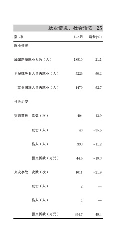就业情况、社会治安 25 指 标 1-5月 增长(%) 就业情况 城镇新增就业人数(人) 18510 -21.1 # 城镇失业人员再就业(人) 5226 -50.2 就业困难人员再就业(人) 1479 -52.7 社会治安 交通事故:次数(次) 404 -13.9 死亡(人) 40 -35.5 伤人(人) 333 -11.2 损失折款(万元) 44.6 -19.3 火灾事故:次数(次) 1011 -21.9 死亡(人) 2 — 伤人(人) 4 — 损失折款(万元) 354.7 -49.4