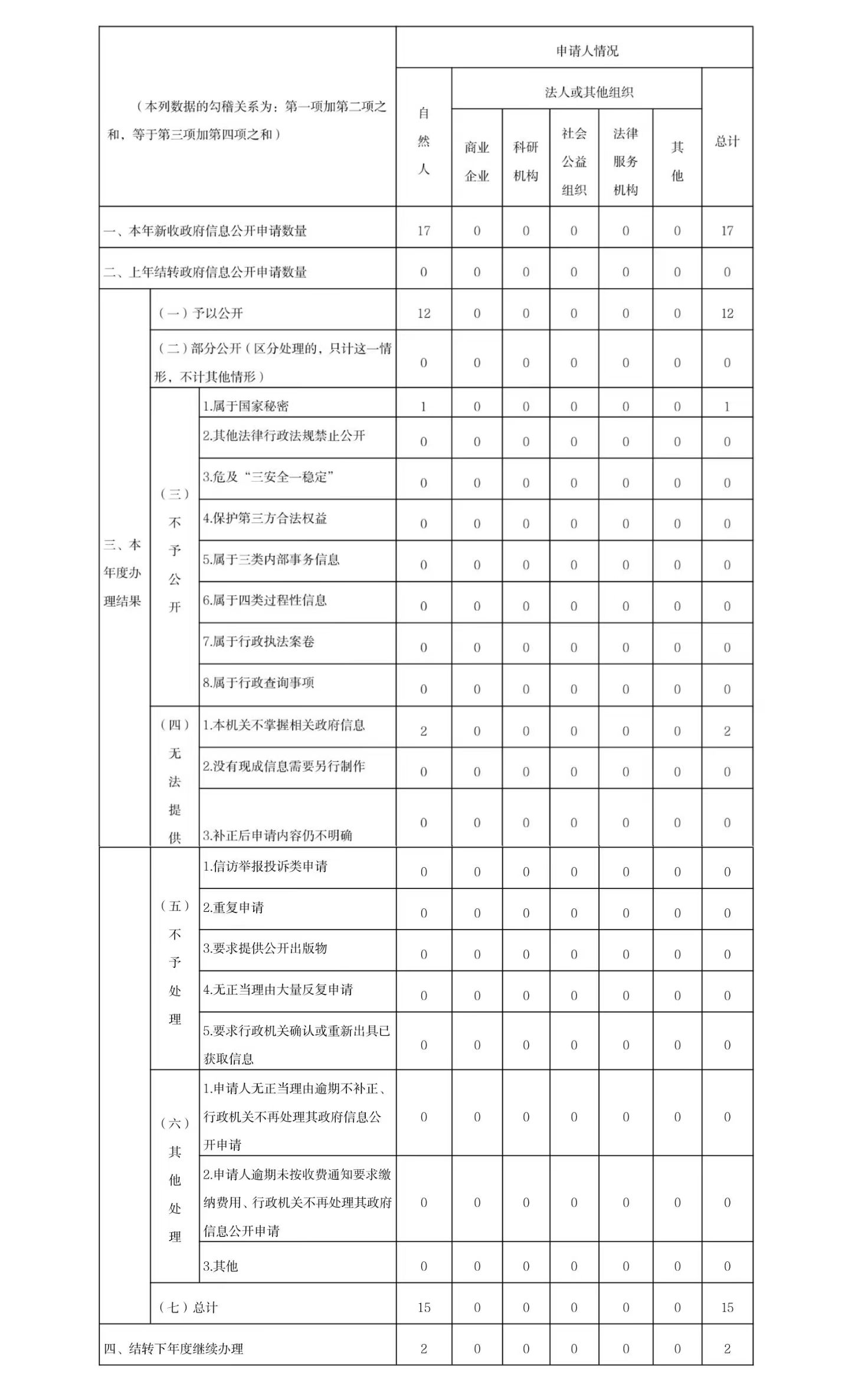 (二)依申请公开情况。进一步做好依申请公开的登记、审核、办理、答复、归档等工作,强化便民解答、指引和服务,推动申请人合理诉求得到实质性解决。全年收到依申请公开17件,其中予以公开12件,不予公开和无法提供3件,结转下年度继续办理2件。2024年,没有发生因政府信息公开引发的行政复议、行政诉讼事件。