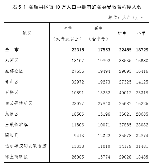 全市常住人口中,拥有大学(指大专及以上)文化程度的人口为631765人;拥有高中(含中专)文化程度的人口为475583人;拥有初中文化程度的人口为880140人;拥有小学文化程度的人口为507448人(以上各种受教育程度的人包括各类学校的毕业生、肄业生和在校生)。与2010年第六次全国人口普查相比,每10万人中拥有大学文化程度的由 14058人上升为23318人;拥有高中文化程度的由18224人下降为17553人;拥有初中文化程度的由38047人下降为32485人;拥有小学文化程度的由20109人下降为18729人。