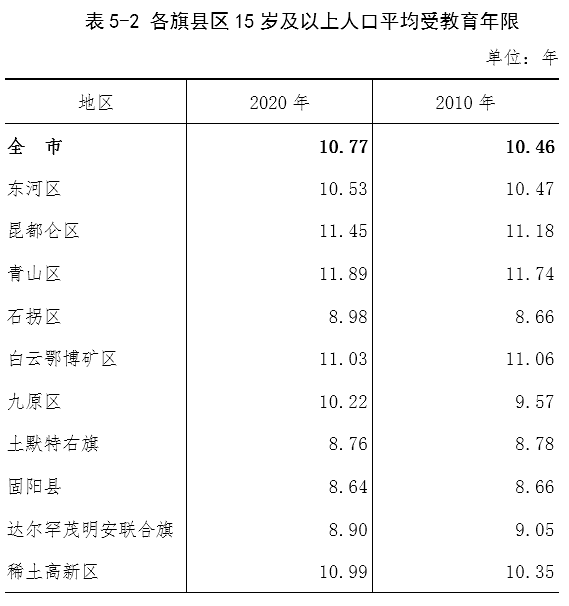 与2010年第六次全国人口普查相比,全市常住人口中,15岁及以上人口的平均受教育年限由10.46年提高至10.77年。