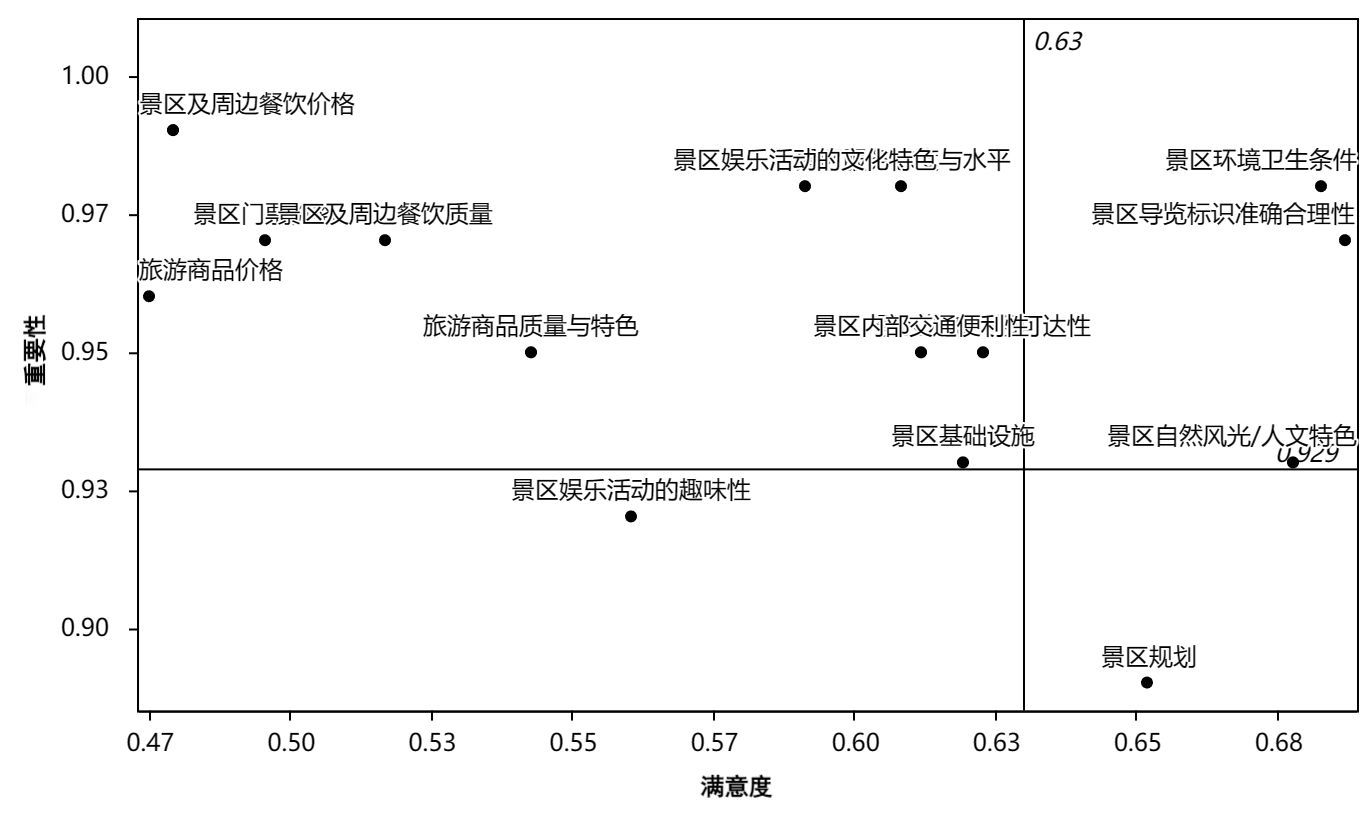 第四象限(保持区)包括景区规划。保持区的满意度大于均值,但重要性小于均值。我市赛汗塔拉、奥林匹克公园等自然风光景区观光游览路线规划合理,武当召、乔家金街等人文景区主题特色鲜明,景区规划总体满意度的表现十分优秀,属于潜在的优势。因此对于该区域项目可以考虑暂时不用投入较大的力度,属于第四发展顺序,但依然应该继续保持。